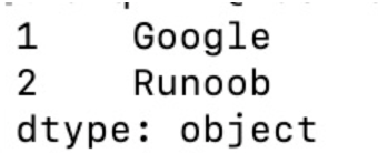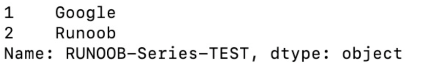 import pandas as pd sites = {1:"Google", 2:"Runoob", 3:"Wiki"} myvar = pd.Series(sites,index = [1,2],name = "RUNOOB-Series-TEST") print(myvar)