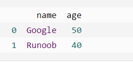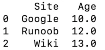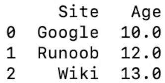 #使用ndarrays创建 import pandas as pd data = {'Site':['Google','Runoob','Wiki'],'Age':[10,12,13]}