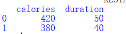 import pandas as pd data = { "calories": [420, 380, 390], "duration": [50, 40, 45] } # 数据载入到 DataFrame 对象 df = pd.DataFrame(data) # 返回第一行和第二行 print(df.loc[[0, 1]])