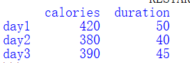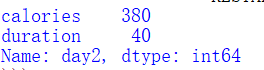 import pandas as pd data = { "calories":[420,380,390], "duration":[50,40,45] } df = pd.DataFrame(data, index = ["day1","day2","day3"]) #指定索引 print(df.loc["day2"])