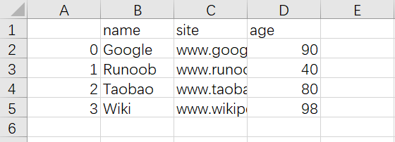 import pandas as pd #三个字段 name,site,age nme = ["Google","Runoob","Taobao","Wiki"] st = ["www.google.com","www.runoob.com","www.taobao.com","www.wikipedia.org"] ag = [90,40,80,98] #字典 dict = {'name':nme,'site':st,'age':ag} df = pd.DataFrame(dict) #保存 dataframe df.to_csv('site.csv')