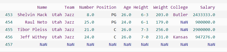 import pandas as pd df = pd.read_csv("nba.csv") print(df.tail())