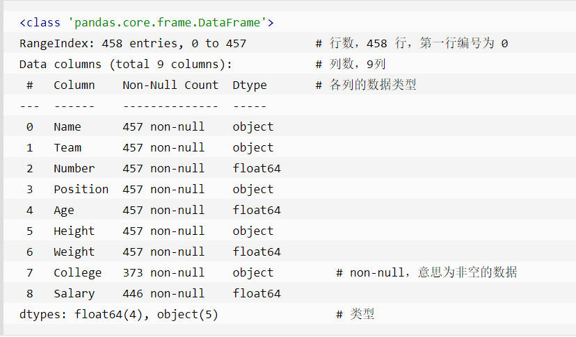 non-null为非空数据,我们可以看到上面的信息中,总共458行,College字段的空值最多。