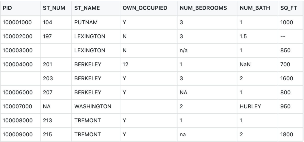 import pandas as pd df = pd.read_csv('property-data.csv') df.dropna(inplace = True) print(df.to_string())