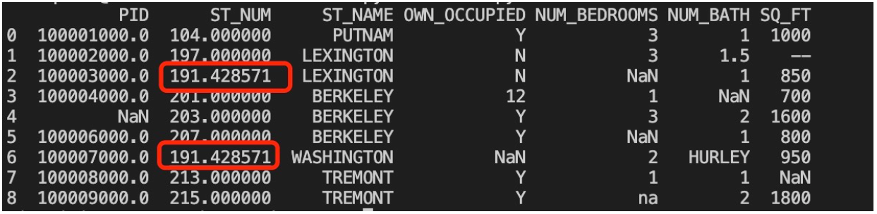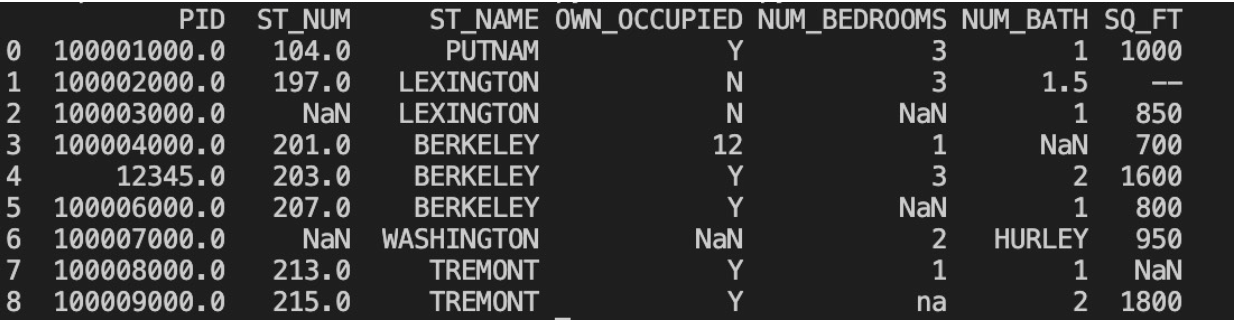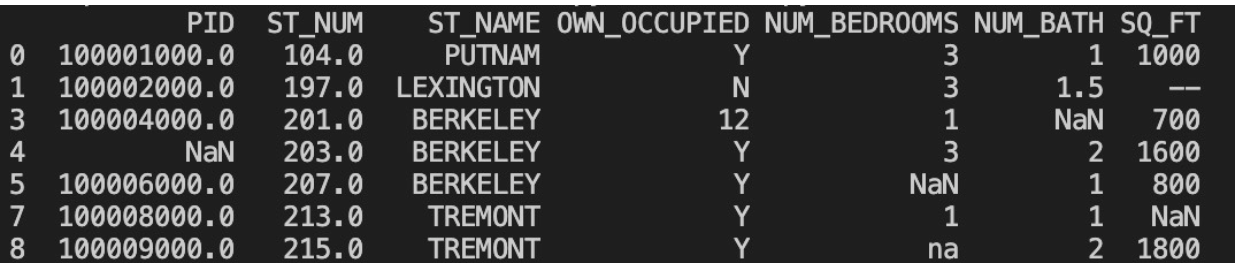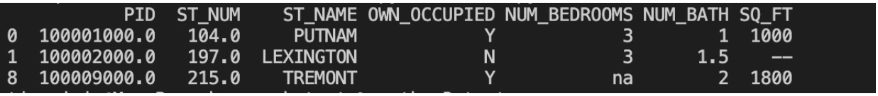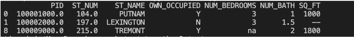 import pandas as pd df = pd.read_csv("property-data.csv") df.dropna(subset = ['ST_NUM'],inplace = True) print(df.to_string())