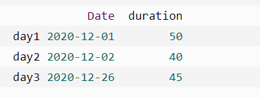 import pandas as pd #第三个日期格式错误 data = { "Date":['2020/12/01', '2020/12/02', '20201226'] "duration":[50, 40, 45] } df = pd.DataFrame(data, index = ["day1","day2","day3"]) df["Date"] = pd.to_datetime(df["Date"]) print(df.to_string())