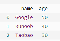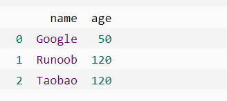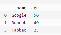 import pandas as pd person = { "name":['Google','Runoob','Taobao'], "age":[50,40,12345] #这里12345 年龄数据是错误的 } df = pd.DataFrame(person) df.loc[2,'age'] = 30 #修改数据 print(df.to_string())