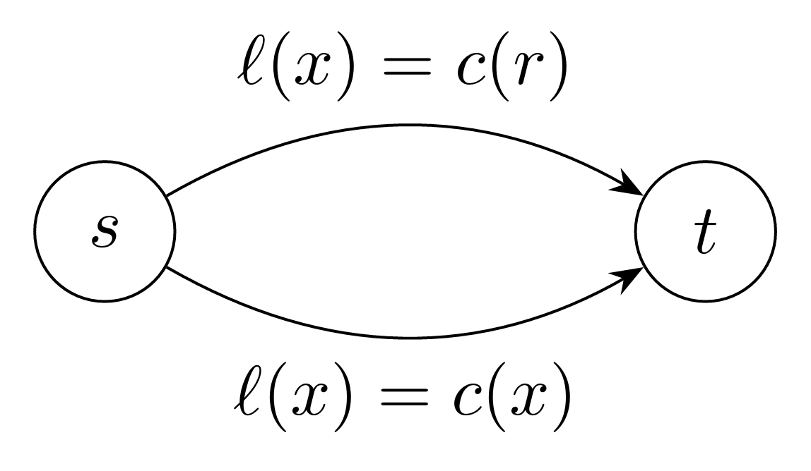Intuitively, marginal cost taxes \(\tau_e^m:=f_e\ell_e'(f_e)\) (where \(f\) is an optimal flow) may help since it induce the optimal flow as a Nash equilibrium.