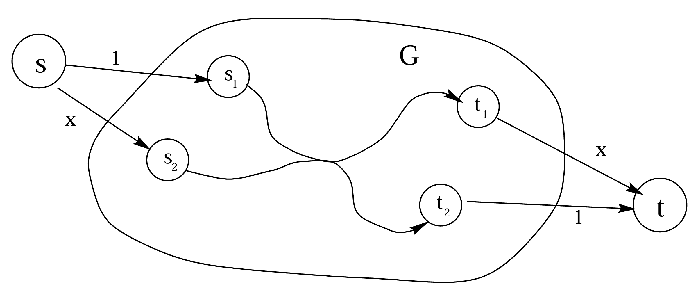 - Type C edges: For each \(i\in\{1,2,...,k\}\), \(e\in \{(w_i,t),(s,v_{k-i+1})\}\), \(\ell^k_e(x)\) is an arbitrary continuous, nondecreasing latency function that \(\ell_e^k(x)=0\) for \(x\le k/(k+1)\) and \(\ell_e^k(x)=i\) for \(x\ge 1\).
