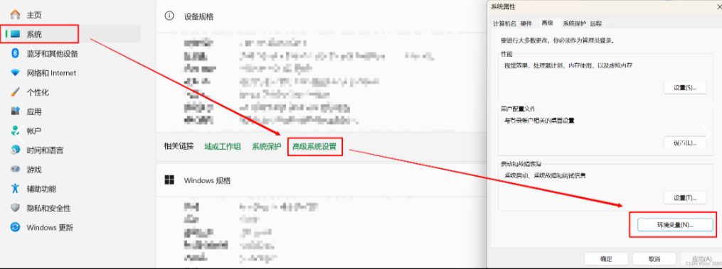 打开环境变量:【此电脑右键】—【系统】—【高级系统设置】—【环境变量】
