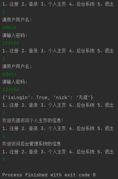 f=int(input('1、注册 2、登录 3、个人主页 4、后台系统 5、退出\n'))