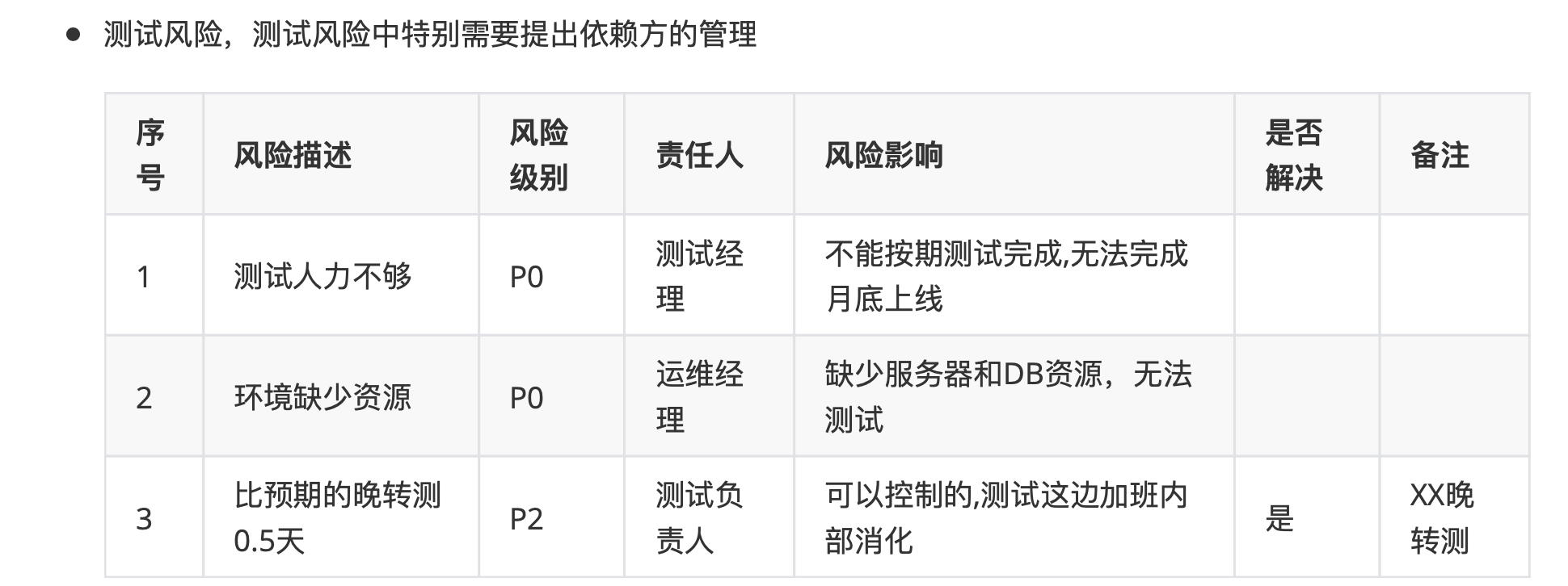 测试范围,测试策略,资源安排,进度安排,发布标准,风险预测