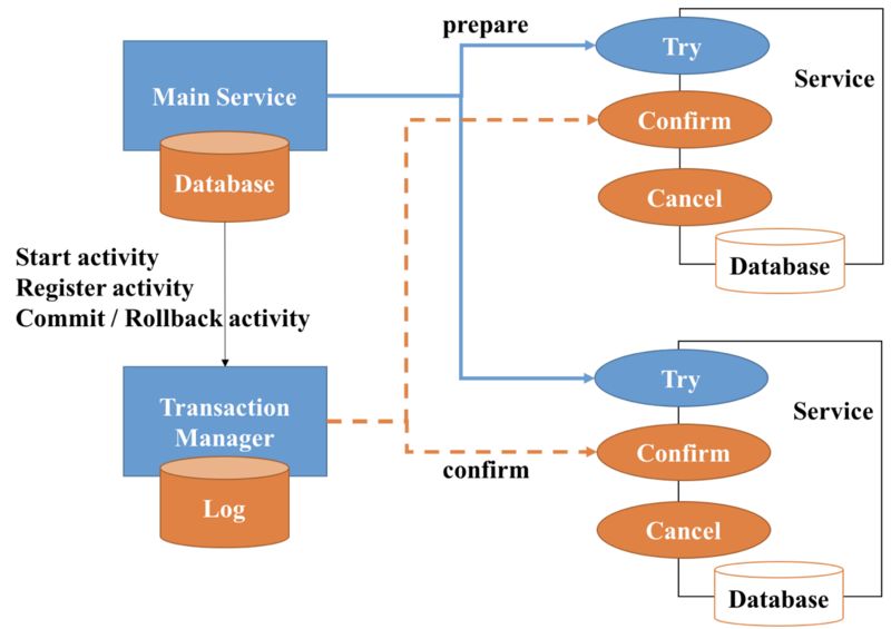 TCC(Try-Confirm-Concel)模型[7] 同样是一种补偿性事务,主要分为Try:检查、保留资源,Confirm:执行事务,Concel:释放资源三个阶段,如下图所示: