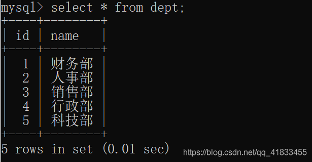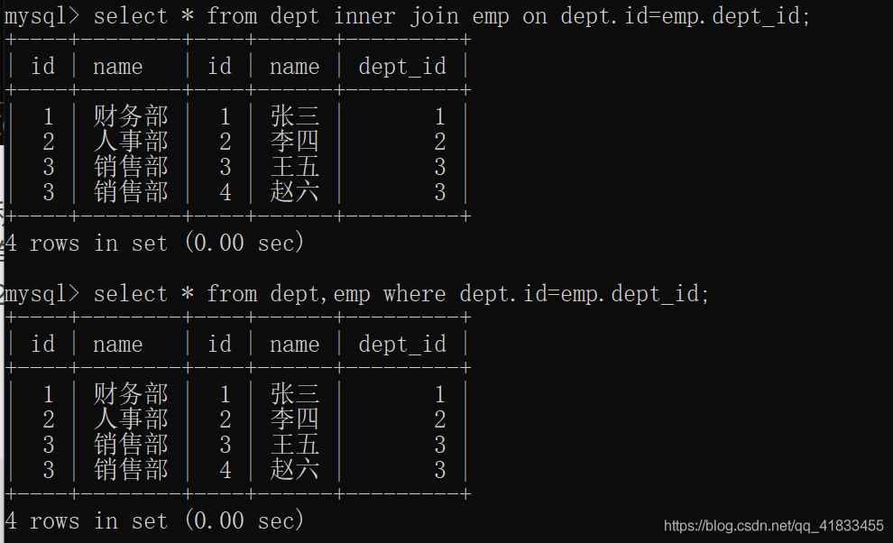 select * from dept inner join emp on dept.id=emp.dept_id; select * from dept,emp where dept.id=emp.dept_id;