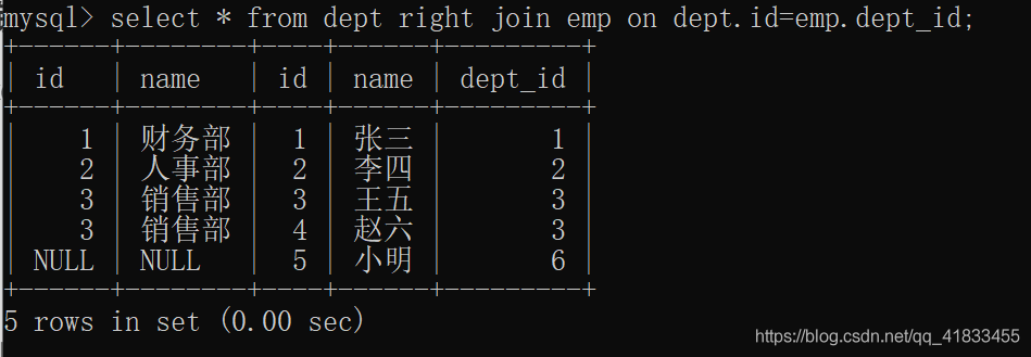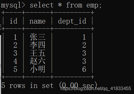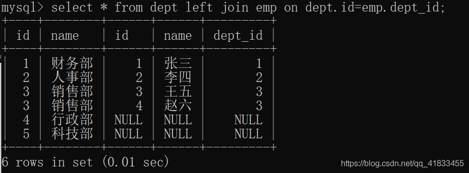select * from dept left join emp on dept.id=emp.dept_id;