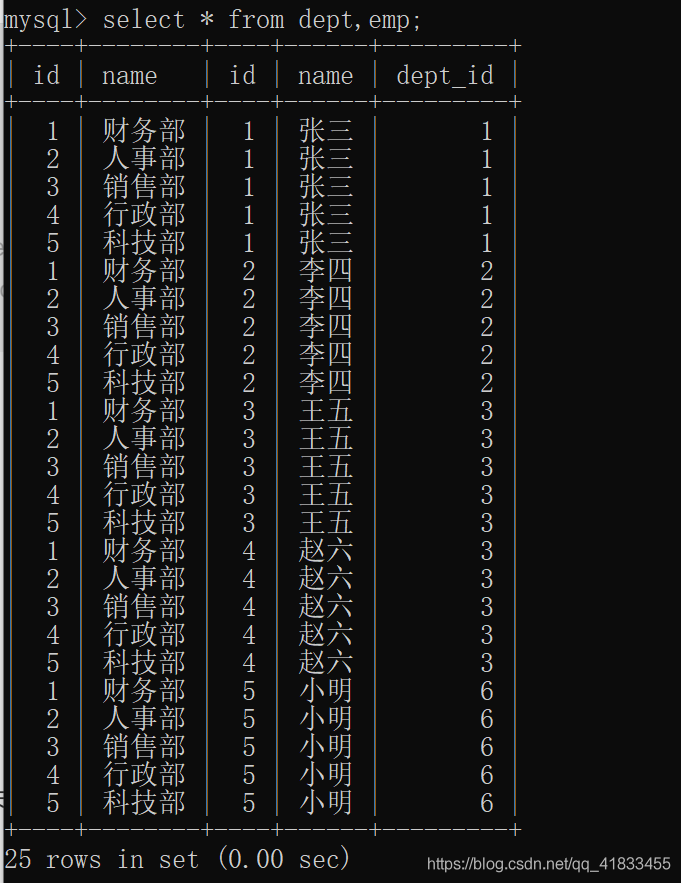 笛卡尔积查询:select * from dept,emp;