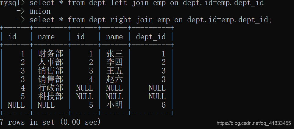 select * from dept left join emp on dept.id=emp.dept_id union select * from dept right join emp on dept.id=emp.dept_id;