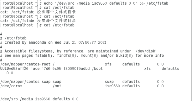 或者 echo "/dev/sr0 /media iso9660 defaults 0 0" >> /etc/fstab 查看文件 :cat /etc/fstab