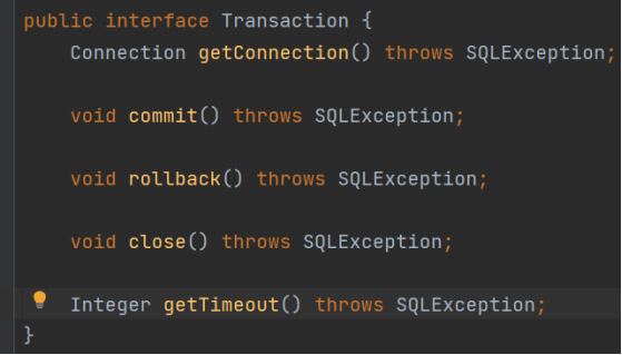 对数据库的事务而言,应该具有以下几点:创建(create)、提交(commit)、回滚(rollback)、关闭(close)。对应地,MyBatis将事务抽象成了Transaction接口,其接口定义如下: