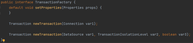 public class JdbcTransactionFactory implements TransactionFactory { public void setProperties(Properties props) { } /** * 根据给定的数据库连接Connection创建Transaction */ public Transaction newTransaction(Connection conn) { return new JdbcTransaction(conn); } /** * 根据DataSource、隔离级别和是否自动提交创建Transacion */ public Transaction newTransaction(DataSource ds, TransactionIsolationLevel level, boolean autoCommit) { return new JdbcTransaction(ds, level, autoCommit); } }