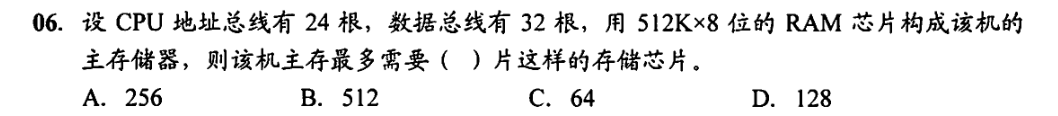 地址线为24根,寻址范围是\(2^{24}\);数据线为32根,字长为32位。主存的总容量\(=2^{24}\times32\)位,因此所需存储芯片数\(=\left(2^{24}\times32\right.\)位\()/(512\mathrm{~K}\times8\)位\()=128\)。