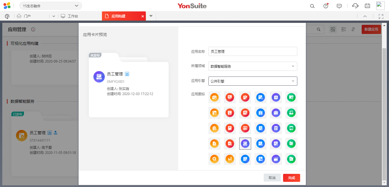 Y o n B u i l d e r支持低代码/无代码开发,通过可视化的拖拽即可完成智能系统的搭建。借助该平台,公司人事部门的3名零基础业务人员花费一个星期搭建了人事管理系统,实现了从招聘到员工入职全流程的信息化、可视化。
