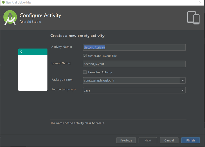 这里我将活动名字命名为SecondActivity布局文件名字命名为second_layout,命名可随意