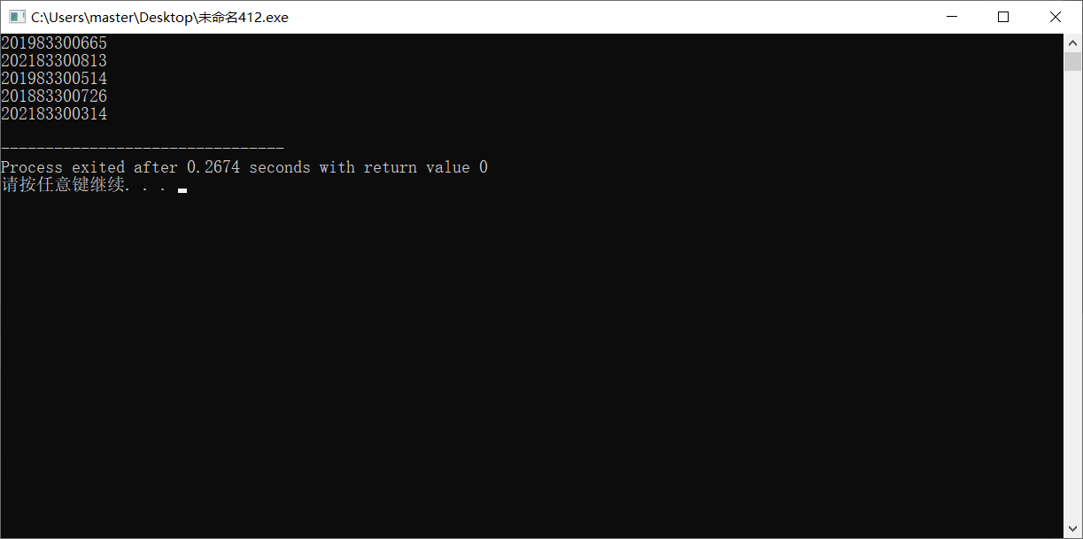 #include <stdio.h> #include <stdlib.h> #include <time.h> #define N 5 int main() { int grade, number; int i; srand(time(0)); // 以当前系统时间作为随机种子 for(i=0; i<N; ++i) { grade = rand()%4 + 2018; number = rand()%999 + 1; printf("%d8330%04d\n", grade, number); } return 0; }