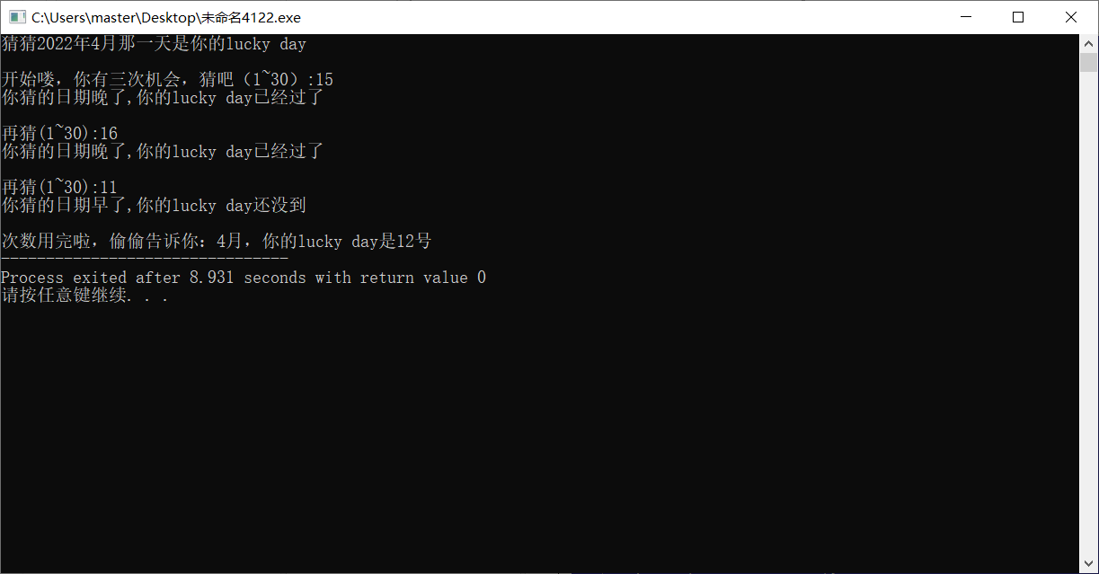 #include<stdio.h> #include<stdlib.h> #include<time.h> int main() { int n,i; printf("猜猜2022年4月那一天是你的lucky day\n\n"); printf("开始喽,你有三次机会,猜吧(1~30):"); scanf("%d:",&n); int m; m = rand()%30+1; for(i=0;i<3;i++){ if (n<m) { printf("你猜的日期早了,你的lucky day还没到\n\n"); if(i<2){ printf("再猜(1~30):");} if(i==2){ printf("次数用完啦,偷偷告诉你:4月,你的lucky day是%d号",m); break;} else{ scanf("%d:",&n); } } else if(n>m) { printf("你猜的日期晚了,你的lucky day已经过了\n\n"); if(i<2){ printf("再猜(1~30):");} if(i==2){ printf("次数用完啦,偷偷告诉你:4月,你的lucky day是%d号",m); break;} else{ scanf("%d:",&n);} } else if(n=m) { printf("哇,你猜对了!"); break; } } return 0; }