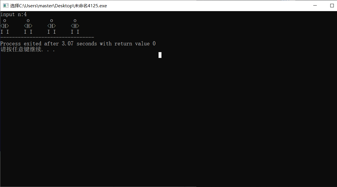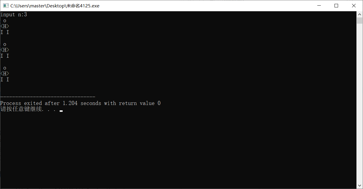 #include<stdio.h> int main(){ int i,n; printf("input n:"); scanf("%d:",&n); for(i=1;i<=n;i++){ printf(" o\n"); printf("<H>\n"); printf("I I\n\n");} return 0; }