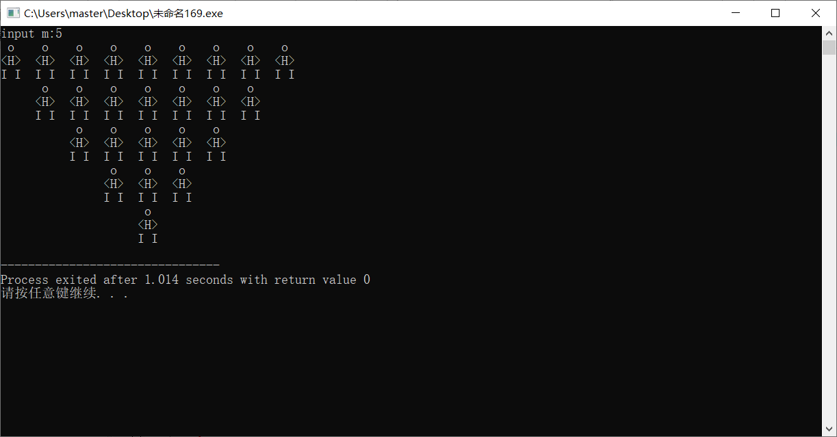 #include <stdio.h> int main() { int i,j,k,m; printf("input m:"); scanf("%d",&i); m=i; for(k=0;k<5;k++) { int a,b,c; a=k+1; b=k+1; c=k+1; while(a>1) { printf(" "); a--; } for(j=1;j<=2*i-1;j++) { printf(" o "); } printf("\n"); while(b>1) { printf(" "); b--; } for(j=1;j<=2*i-1;j++) { printf("<H> "); } printf("\n"); while(c>1) { printf(" "); c--; } for(j=1;j<=2*i-1;j++) { printf("I I "); } printf("\n"); i--; } return 0; }