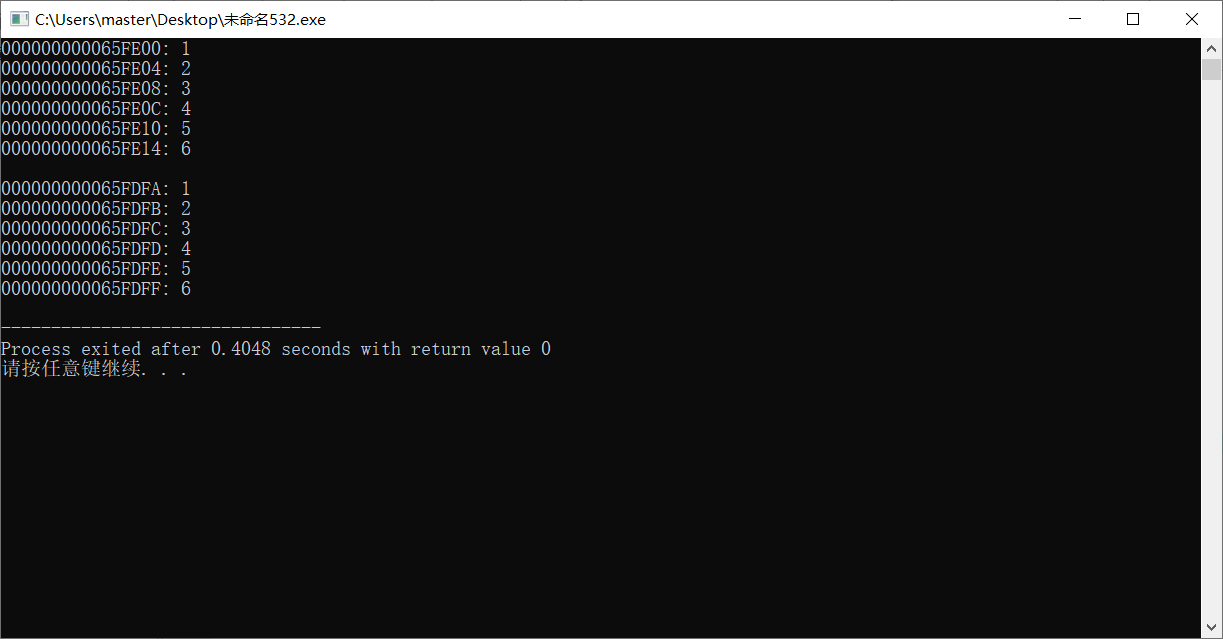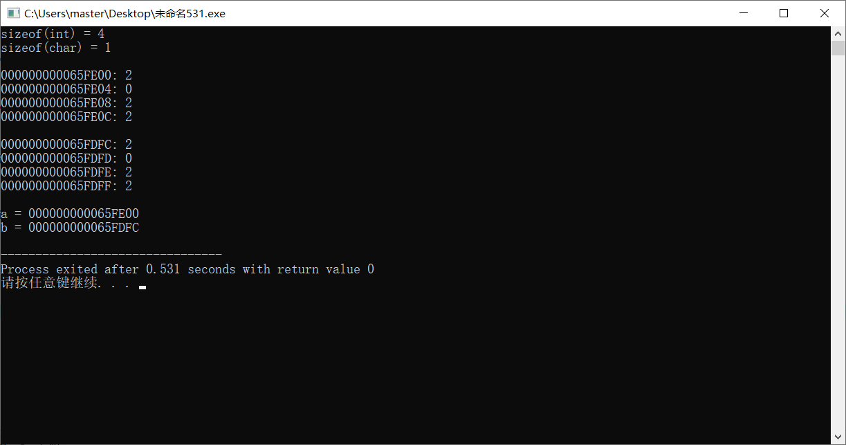 #include<stdio.h> #define N 4 int main() { int a[N]= { 2,0,2,2}; char b[N] = { '2','0','2','2'}; int i; printf("sizeof(int) = %d\n", sizeof(int)); printf("sizeof(char) = %d\n", sizeof(char)); printf("\n"); for (i = 0; i < N; i++) printf("%p:%d\n", &a[i], a[i]); printf("\n"); for (i = 0; i < N; i++) printf("%p:%c\n", &b[i], b[i]); printf("a = %p\n", a); printf("b = %p\n", b); return 0; }
