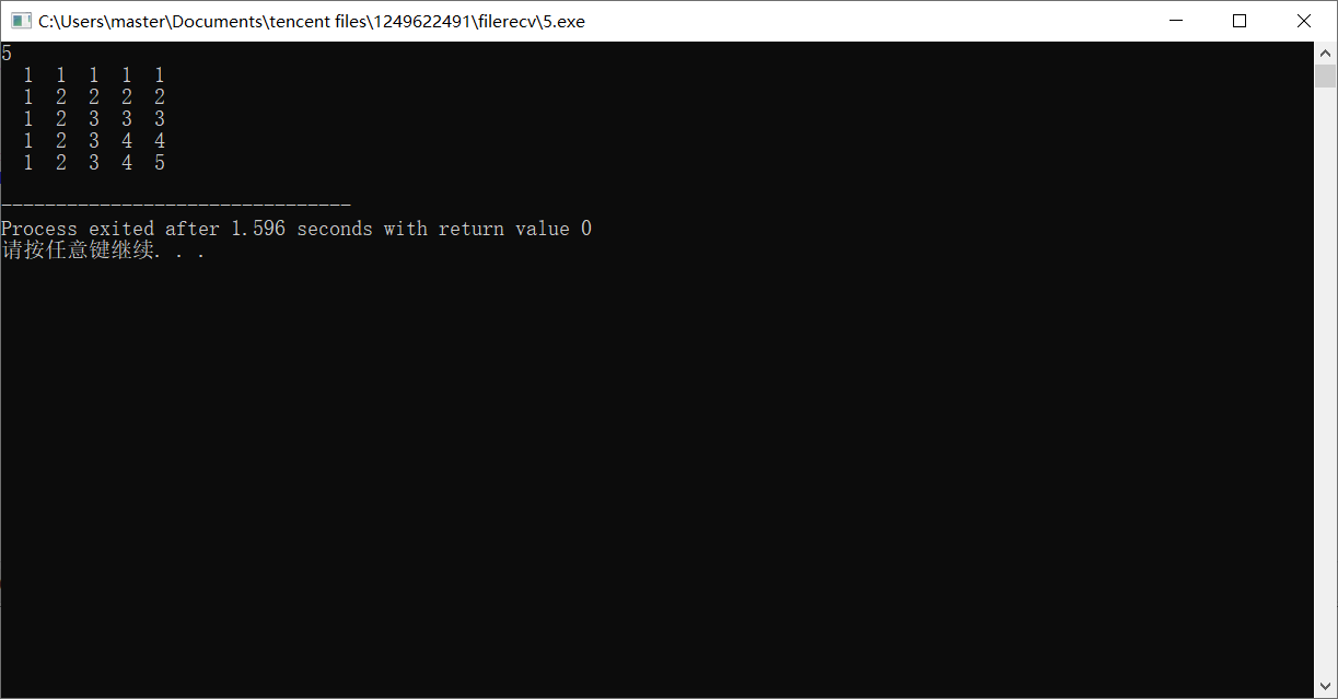 #include<stdio.h> int main() { int a[100][100]; int n; int i, j, k; scanf("%d", &n); for (i = 1; i <= n; i++) for (j = i-1; j < n; j++) for (k = i-1; k < n; k++) a[j][k] = i; for (i = 0; i < n; i++) { for (j = 0; j < n; j++) printf("%3d", a[i][j]); printf("\n"); } return 0; }