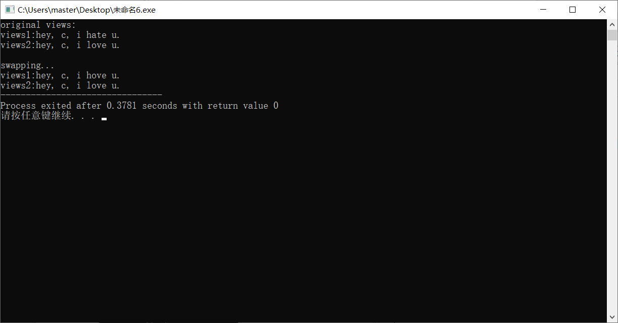 #include <stdio.h> #define N 80 int main() { char views1[N] = "hey, c, i hate u."; char views2[N] = "hey, c, i love u."; printf("original views:\n"); int i; printf("views1:"); for( i=0;views1[i]!='\0';i++ ) printf("%c",views1[i]); printf("\n"); printf("views2:"); for( i=0;views2[i]!='\0';i++ ) printf("%c",views2[i]); printf("\n\n"); printf("swapping...\n"); views1[11]=views2[11]; views1[12]=views2[12]; views1[13]=views2[13]; views1[14]=views2[14]; printf("views1:"); for( i=0;views1[i]!='\0';i++ ) printf("%c",views1[i]); printf("\n"); printf("views2:"); for( i=0;views2[i]!='\0';i++ ) printf("%c",views2[i]); return 0; }