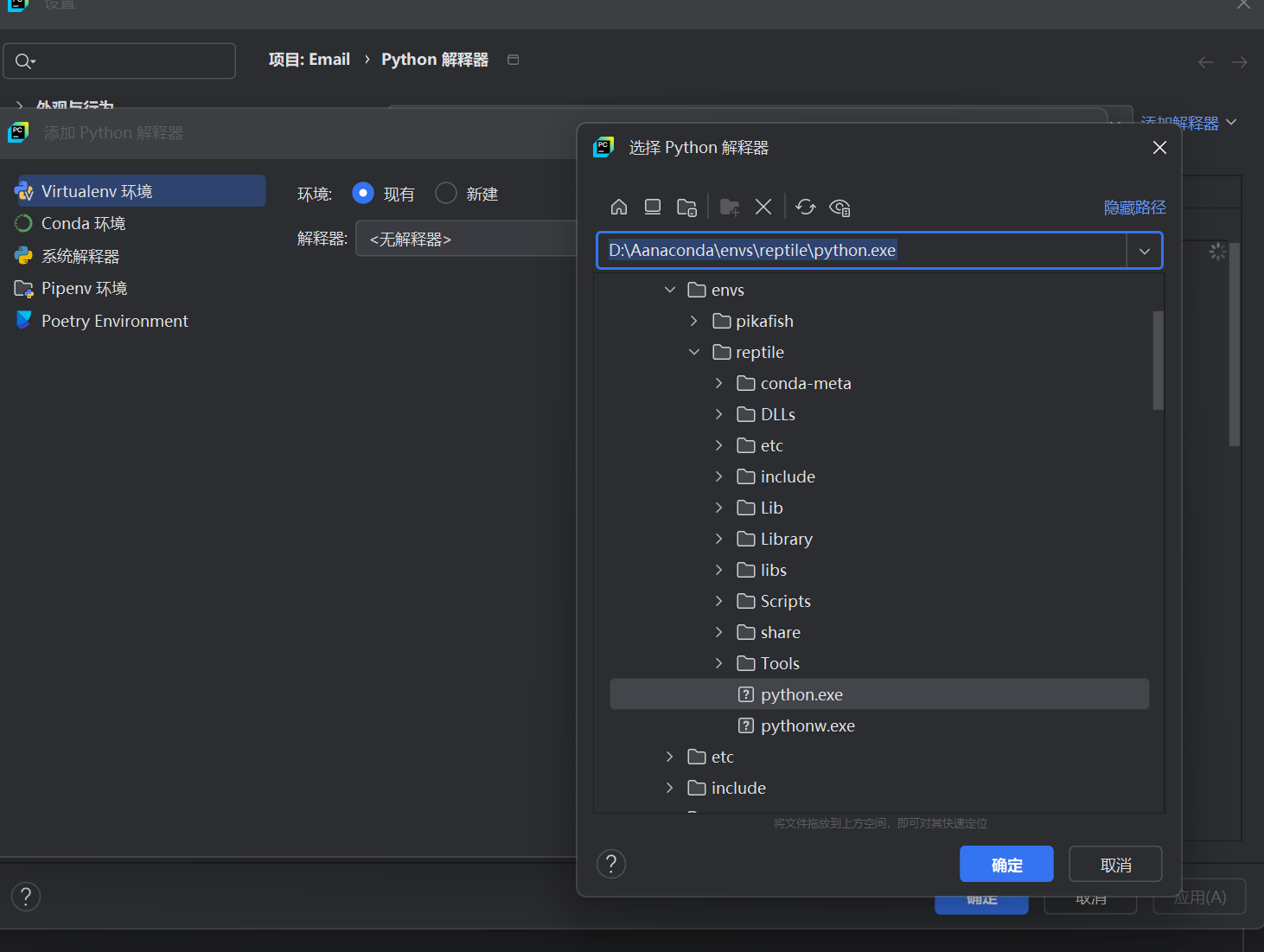 Virtualenv环境->现有->envs目录 中 你要选的环境的 python.exe
