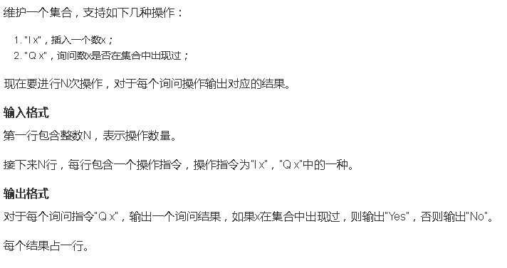 #include<bits/stdc++.h> using namespace std; const int mod = 100007; int h[mod+5],ne[mod+5],d[mod+5]cnt; void add(int x) { int u=(x%mod+mod)%mod; d[++cnt]=x; ne[cnt]=h[u]; h[u]=cnt; } bool find(int x) { int u=(x%mod+mod)%mod; for(int i=h[u];i;i=ne[i]) if(d[i]==x)return 1; return 0; } int main() { int n,x; cin>>n; char c; for(int i=1;i<=n;++i) { cin>>c>>x; if(c=='I')add(x); else{ if(find(x))puts("Yes"); else puts("No"); } } return 0; }