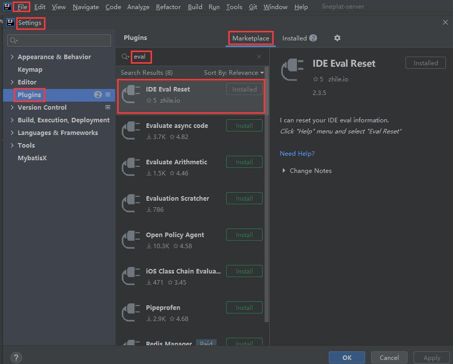 如果激活jar包找不到了,可以如图6方式进入到idea后,File-Settings-Plugins-Marketplace插件市场搜索【IDE Eval Reset】插件,如下图7: