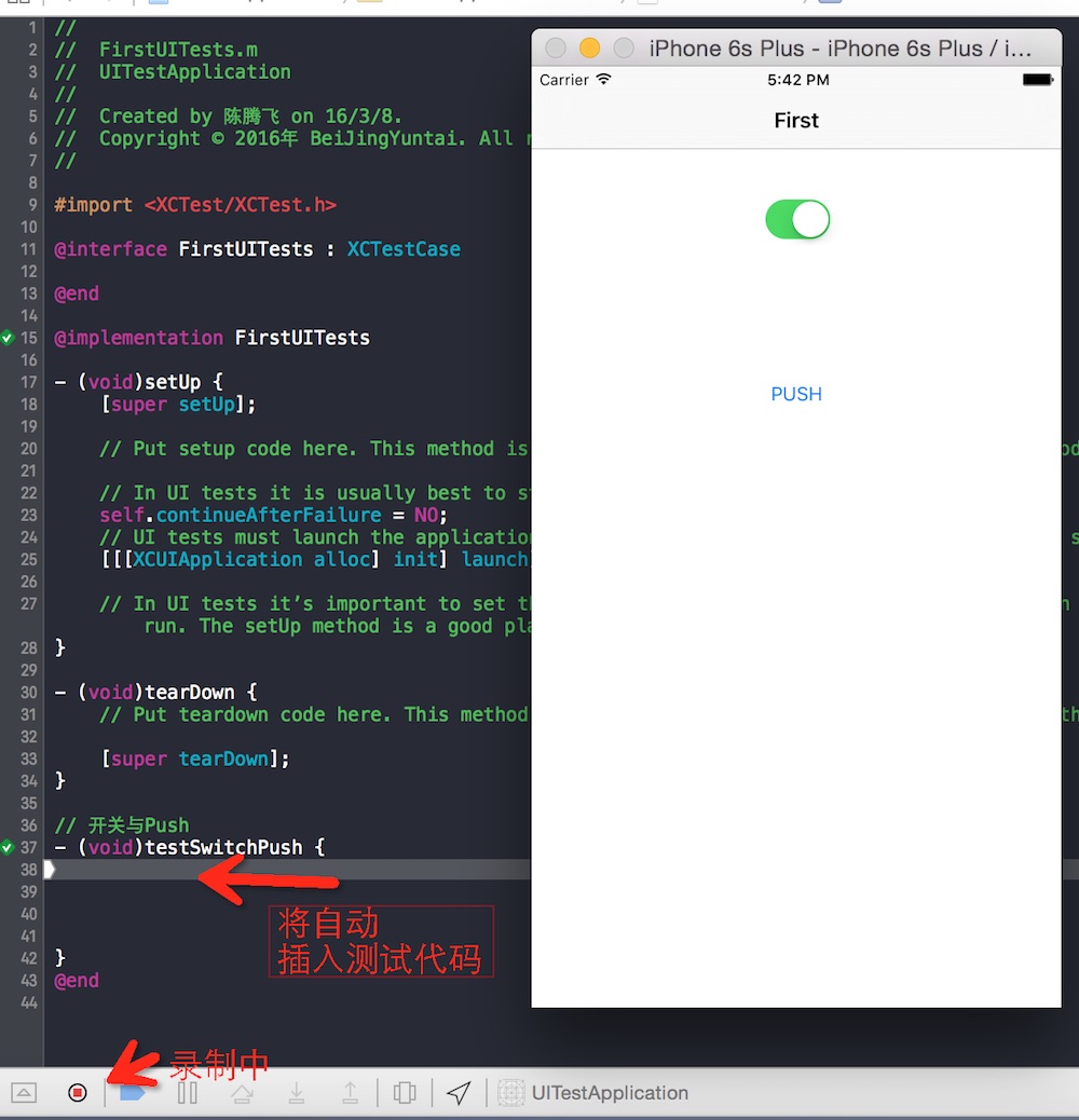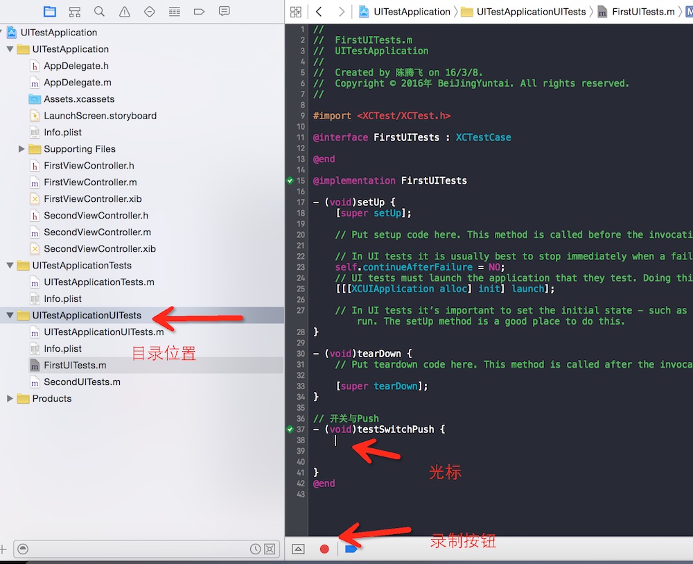 1. 先创建FirstUITests类,继承自XCTestCase类,创建一个空测试方法,将光标放到第一行处。