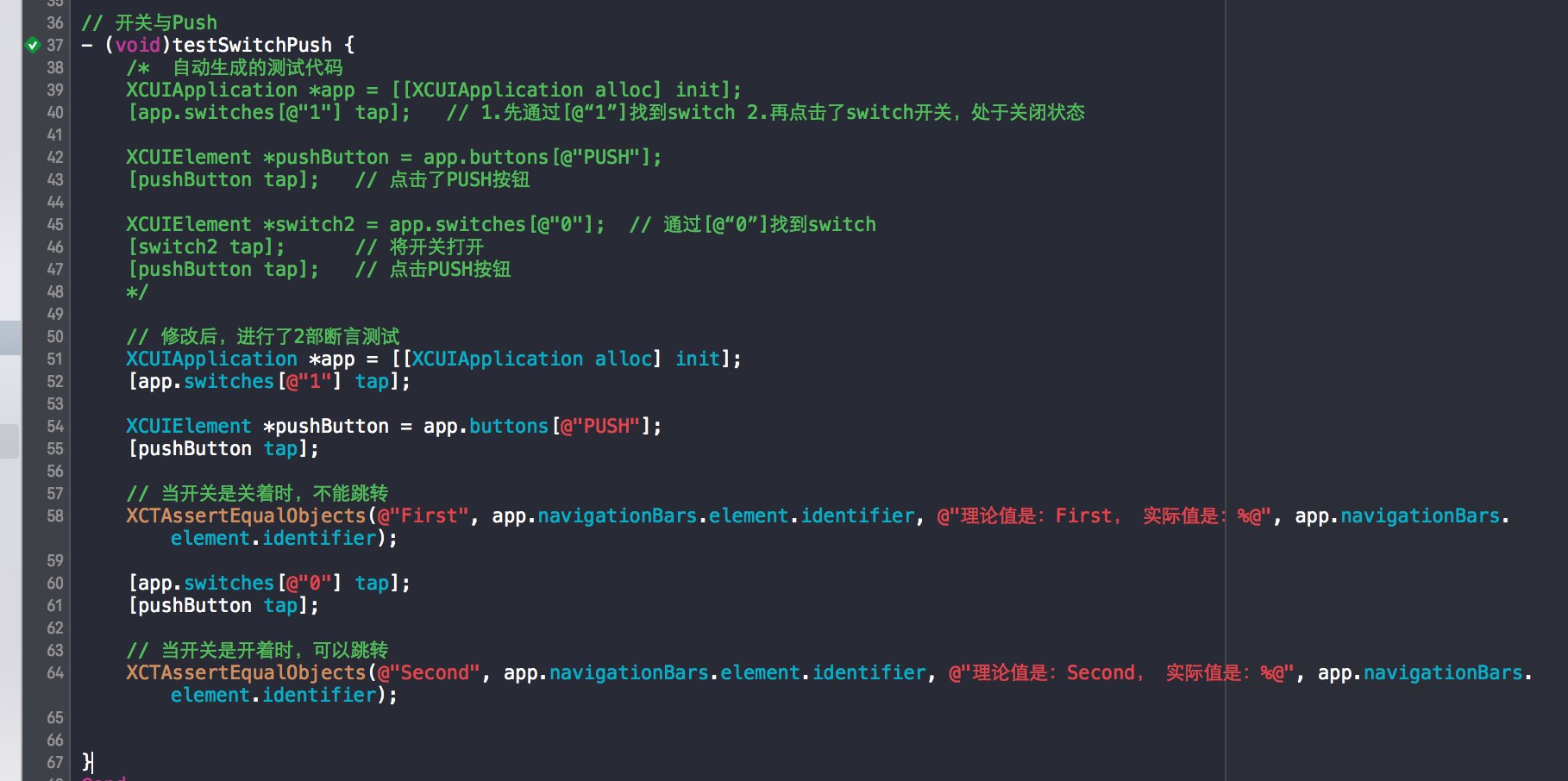 4. 将生成的测试代码进行修改,实现断言测试(1.First上的开关是开这时,才能push到Second页面)