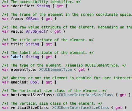 - XCUIElement类:实现协议XCUIElementAttributes, XCUIElementTypeQueryProvider ,可以用来表示UI控件