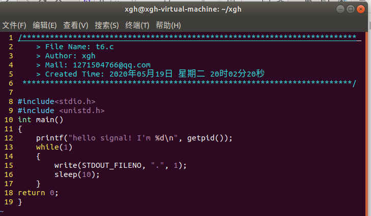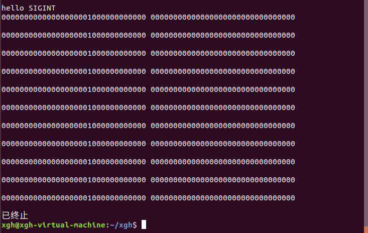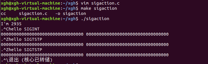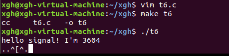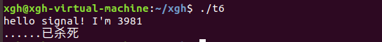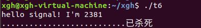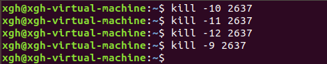 2) 再开启一个终端,在终端通过输入 kill 命令来给进程发送信号,进程的 pid 在程序运行的第一 行输出,每次运行程序的时候 pid 是不同的。