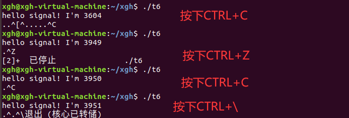 在当前终端通过按键组合向该进程发送信号 CTRL+C 、 CTRL+Z 、 CTRL+\ ,在每一次运行该程序的时候分别通过按键发送不同的信号来观察进程的反应。这里三个按键组合说明要发送三个信号,所以要运行该程序三次,然后每次使用不同的按键组合来观察。