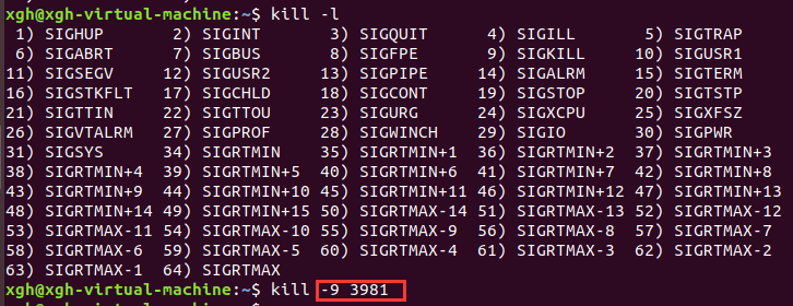 重新运行程序,并根据当前终端的进程id 3981,再到另一个终端通过kill命令想该进程发送信号值为9的信号。可以发现进程收到信号后被杀死: