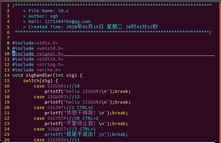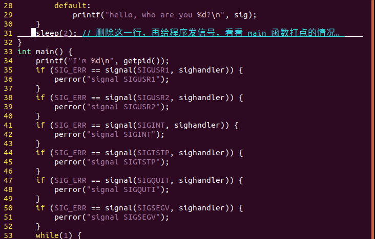 1. 编写一个简单的程序并运行,然后向该进程发送不同的信号以观察该进程对接收到信号的反应。