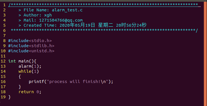 虽然程序中有无限循环,不断输出字符串 process will finish! ,由于调用了 alarm(1) 函数,alarm 函数会在1秒后给该进程发送 SIGALRM 信号,然后进程结束。
