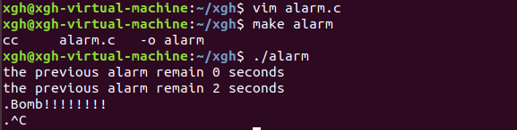 这里计时时间到了并不会结束进程,因为我们编写了信号捕捉函数,产生 SIGALRM 信号后会输出字符串 Bomb!! , 我们可以键盘按键组合结束进程,这里我用了 CTRL+C 。
