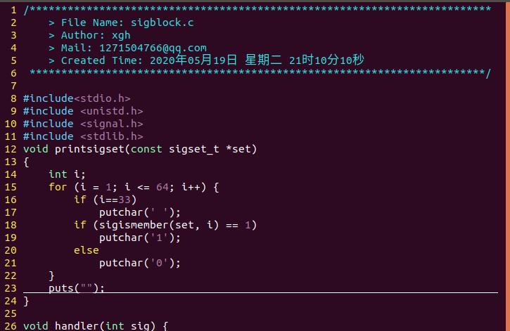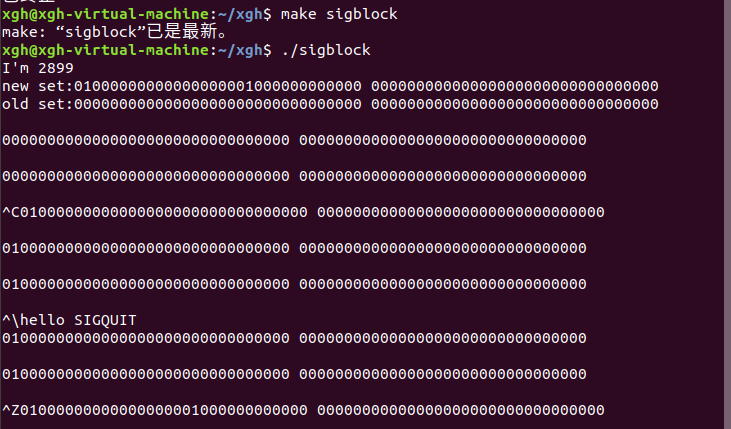 下面结合例子来理解,程序的功能是先把 SIGINT 、 SIGTSTP 加入到了进程阻塞信号集中去。接下来,每隔一秒打印一次未决信号集,第 10 次的时候,又把 SIGINT 信号从阻塞信号集中删除。