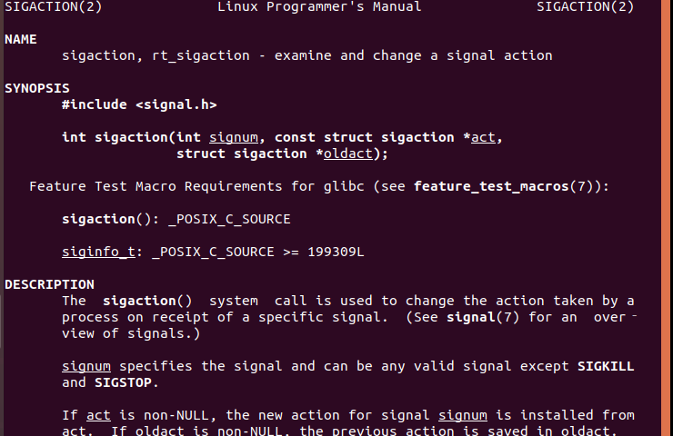 不同于 signal 函数, sigaction 函数是符合 POSIX 标准的,而 signal 只是 ANSI C 定义的函数。除了上面的区别外, sigaction 提供了更多的功能。比如它可以处理带参数的信号,在信号处理的时候,可以屏蔽其它信号等等。我们通过 man 2 sigaction 来查看手册: