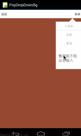 而且,只有加上它之后,PopupWindow才会对手机的返回按钮有响应:即,点击手机返回按钮,可以关闭PopupWindow;如果不加setBackgroundDrawable()将关闭的PopupWindow所在的Activity.