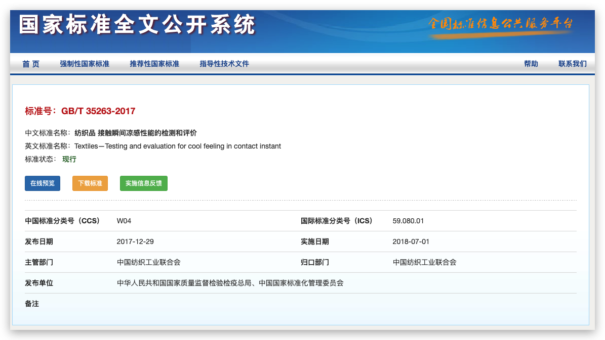 中文标准名称:纺织品 接触瞬间凉感性能的检测和评价